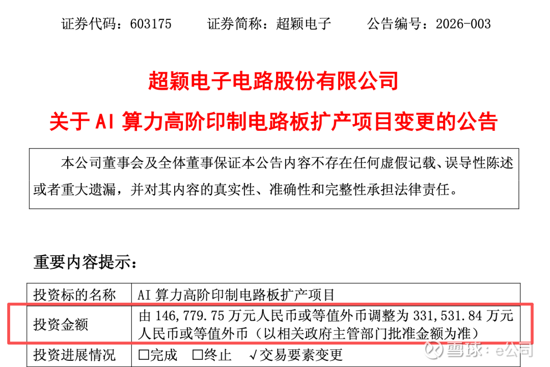 超颖电子:AI算力高阶印制电路板扩产项目投资金额变更为33.15亿元。