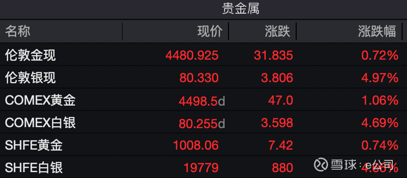 1月6日晚间,美股三大指数开盘均上涨。贵金属集体狂飙,现货白银升破80美元/盎司,日内涨近5%;现货黄金短线走高,突破4480美元/盎司;钯金、铂金也狂拉,截至发稿均涨超6%。