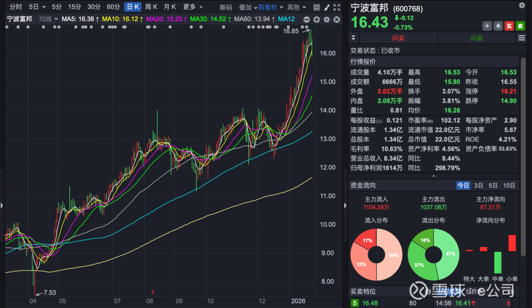 截至1月27日收盘,宁波富邦股价为16.43元/股,总市值22亿元。