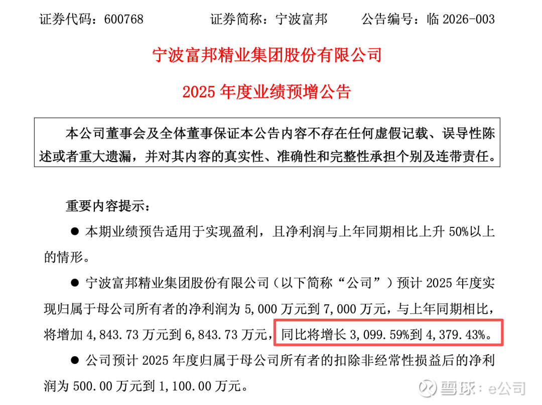 1月27日晚,宁波富邦(600768)发布业绩预告,预计2025年度净利润为5000万元到7000万元,同比增长3099.59%到4379.43%。