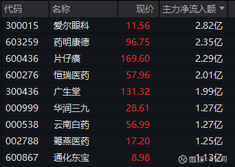 Wind实时监测数据显示,截至午间收盘,申万医药生物行业获得逾25亿元主力资金净流入。爱尔眼科、药明康德、片仔癀等9股获得超亿元净流入。