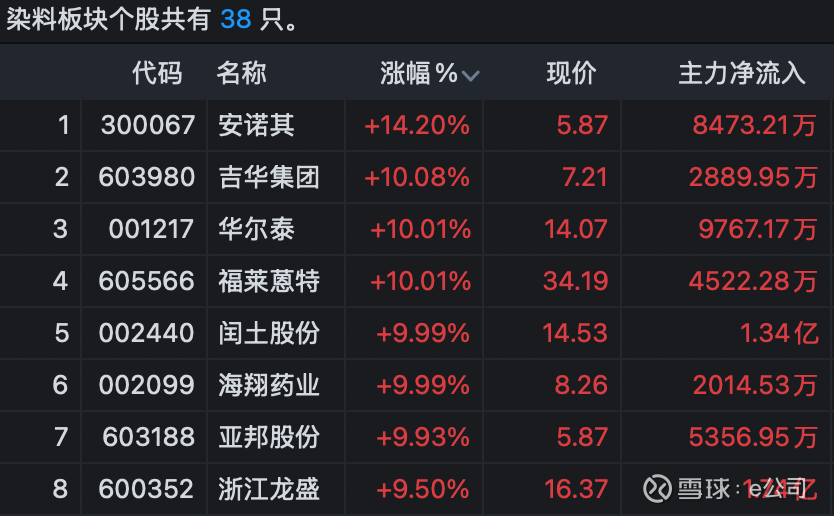染料行业的涨价热潮也直接反映在资本市场。2月9日,A股染料板块集体走强,多只个股实现涨停,其中福莱蒽特、闰土股份、吉华集团、亚邦股份等先后封板,安诺其涨幅更是高达14.2%,板块整体表现亮眼。