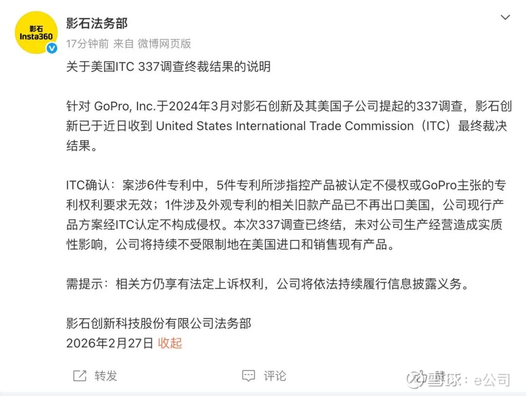 2月27日,影石创新(688775)公告,美国337调查终裁落定:美国国际贸易委员会(ITC)维持初裁,判定GoPro六项指控均不成立。这场始于2024年3月的调查,以影石的全面胜利告终。