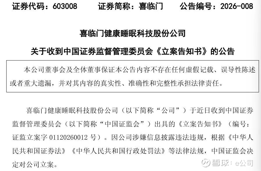 喜临门(603008)公司及实控人同时被立案。