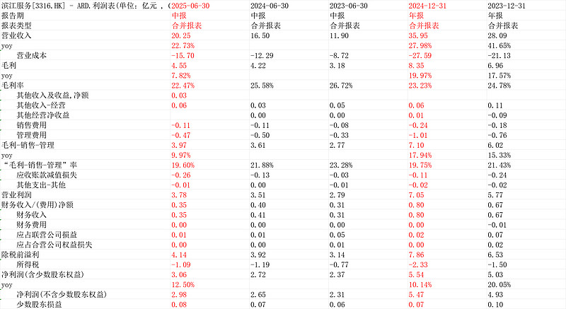 顺便估值,当前20250824,滨江服务市值69亿港币约63亿人民币,ev是63-15=48亿ev。上半年营业利润增长10%,去年净利润5.54亿增长10%是6.1亿,扣除利息(8000万利息扣税算7000万好了)后是5.4亿。48/5.4=8.89倍。