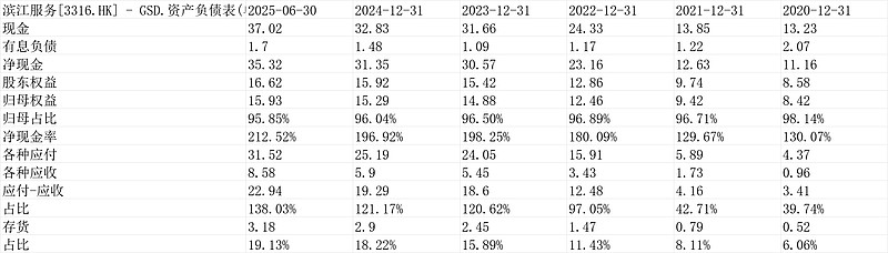20250824,滨江服务非常典型的净现金公司,没什么多少商誉,大部分资产是各种存款,上下游占款占款别人多,存货有点,其他固定资产占比很少。总体是轻资产公司,简单可以认为归母的15.93亿大头是净现金(算15好了)。可以作为ev的扣减项。