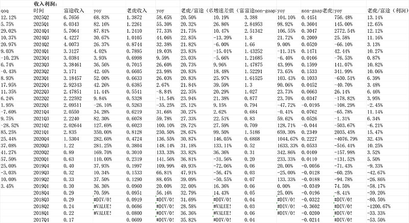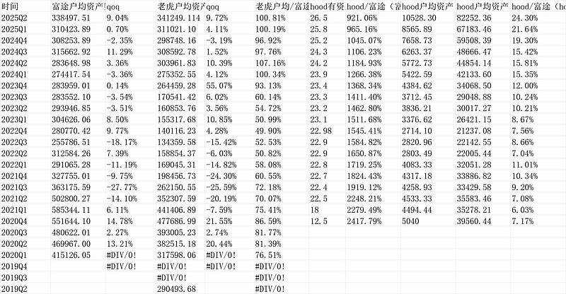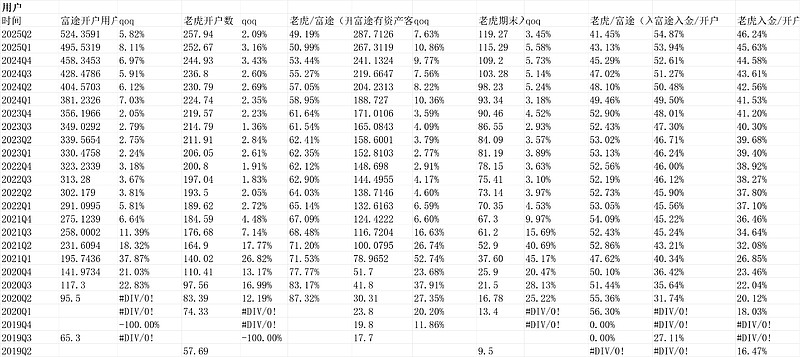 入金老虎/富途2020Q1疫情开始时候(5年前)是56.3%,最新是2025Q2是41.45%;最新单季度富途的交易用户数287.7126万qoq7.63%,也大幅快于老虎的119.27万3.45%。