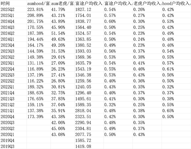 最终看aum就简单了,hood/富途最近几个季度一直提升,啥意思,富途够优秀了,但从aum角度,hood还要更猛一些。这大家就能理解此前我那么看好hood了,hood路径清晰,战略有野心执行力强,面对的市场也更肥沃一些,数据也体现了。