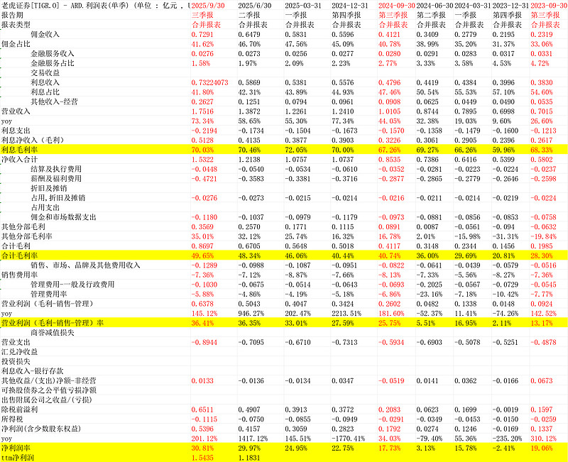 2.当然,上边是按净利润的比较,老虎便宜一倍,但因为老虎的运营效率(利润率)低,其他指标,如市值/用户数,市值/管理资产,市值/收入等等,老虎都不止便宜1倍以上。但核心是2025Q3市场上行是牛市,如果反过来转熊,利润率比较低的反而会利润跌更多,甚至稍不注意亏损(如1-2年前富途vs老虎情况),那么用利润比较老虎反而会更贵。