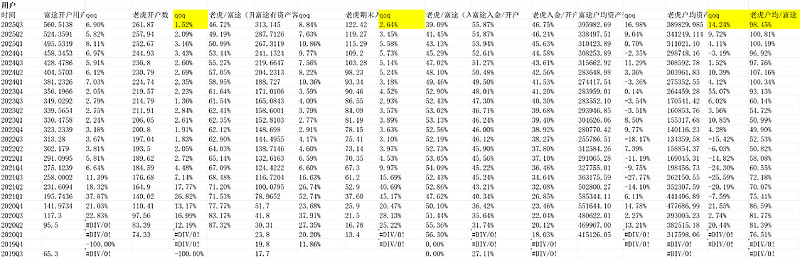 标黄处看出来,关键指标增速老虎无一例外差于富途,这是更低的基数的背景下。尤其开户数,富途560.5万qoq6.9%加速,但面临同样Q3牛市环境,老虎261.87万用户qoq1.52%,户均资产也略慢。
