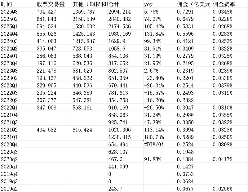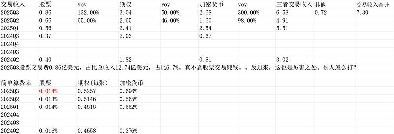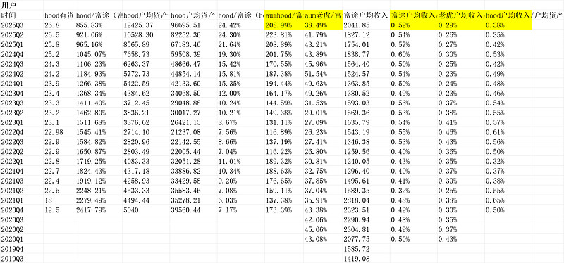 ②整体看变现率,即,每一分在管资产,券商综合得到的收入,富途0.52%,老虎0.29%,hood0.38%,老虎比较少收费,也导致最终利润率如开头说的,不是一个行业。