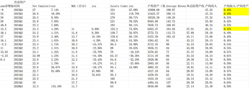 最核心的两个,有资产用户2700万yoy7%但增速下滑,管理资产Assets Under Custody (AUC)3240亿美元,环比下滑90亿美元,而公布净存款159亿美元,可以认为Q4平台客户合计亏损249亿美元,亏损8%,也算合理。