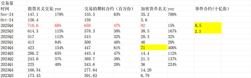 期权和加密货币和此前给的月度差不多,但有点出入,事件活跃爆发,2025Q3是23亿到85亿,这个确实爆了。