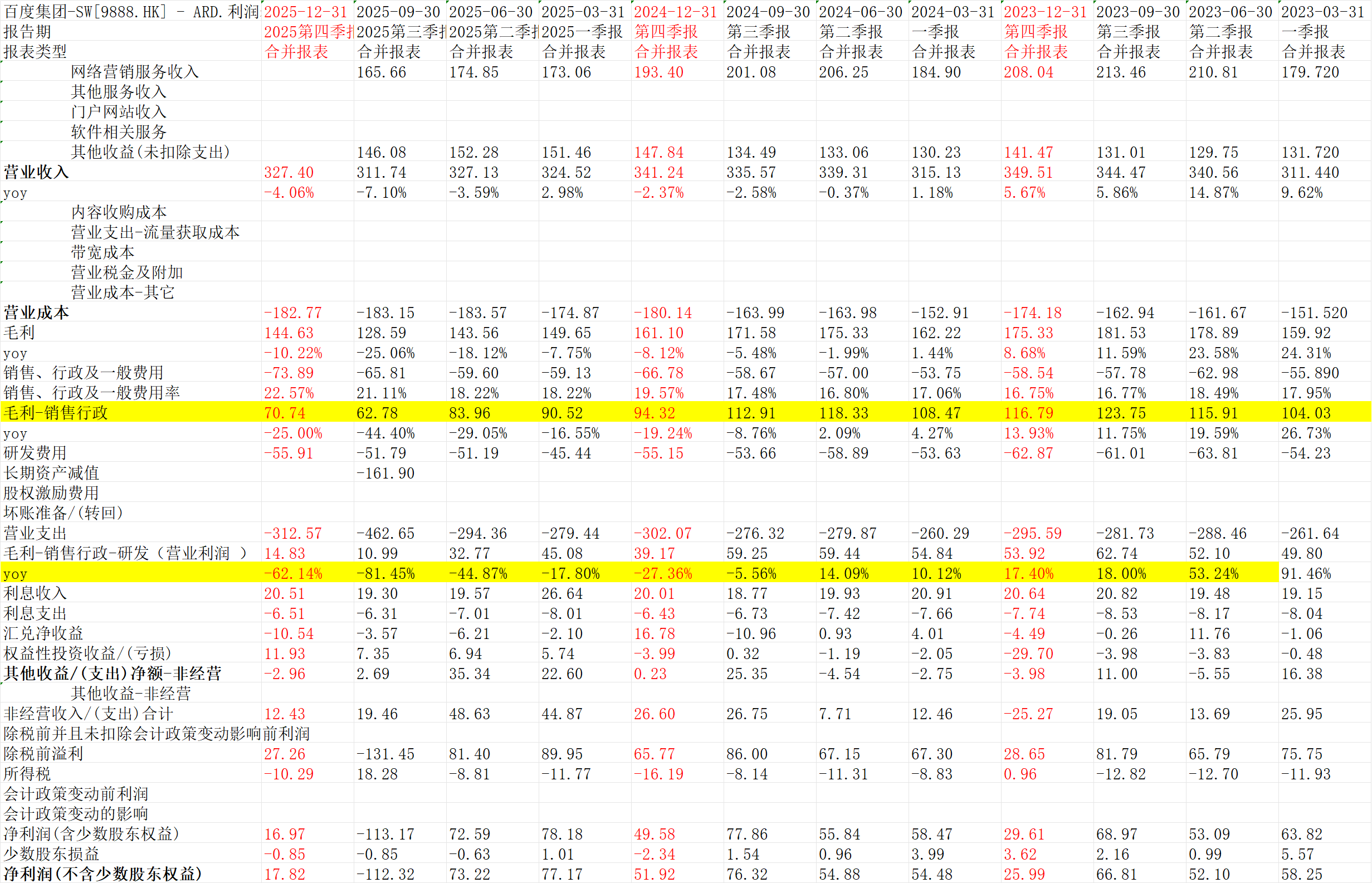 百度利润确实下滑得吓人,竞争格局或行业突变,历史业绩当不得数,确实投资难度加大。最核心指标,2025Q4“毛利-销售行政”70.74亿yoy-25%,营业利润“毛利-销售行政-研发”14.83亿,yoy-62.14%。百度轻资产,目前市净率1.1倍(港股股价117.4,市值3226亿港币)。换言之,目前市场都认为百度是起不来得,给的估值极低,这个时候看到得利空未必是利空。那个50pe也没啥意义。不能作为高低的理由。(一个观点,不一定对)查看图片