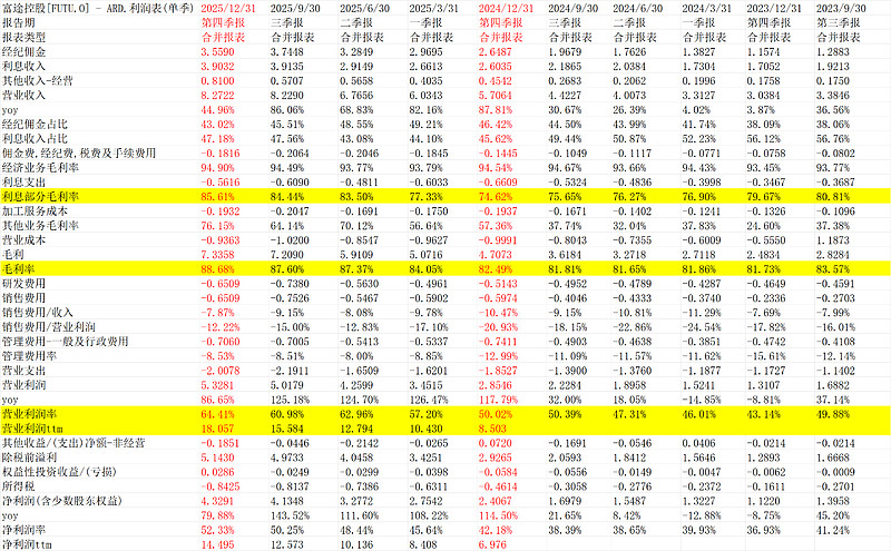 2025Q4收入8.2722亿美元,yoy44.96%,环比大概持平;2025Q4毛利率88.68%环比还提升,销售费用率7.87%,大幅降低2.5个百分点,但用户数增长依然ok,说明,富途如前几个季度一样,很多人认为用户会叛逃,数据会说话。事实数据胜于观点,有事实数据,就信事实不信观点。