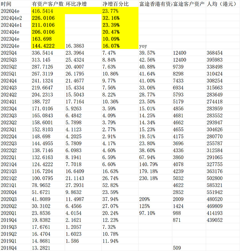 2025Q4环比增加23.3964万用户数,只略小于Q3,2025年全年下来新增用户数95.409万,2024年全年新增70.1万,2025年给的指标是新增80万,实际做到95.409万,富途历史看一向给的保守。【富途2024Q4财报点评——可预期,但确实优秀】网页链接