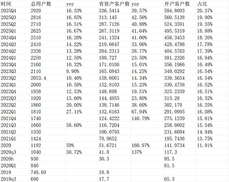 其他的先行指标:2025Q4总用户2920万,开户数594.8093万,开户占比20.37%,占比在不断缓慢提升。。这些指标都很良性。