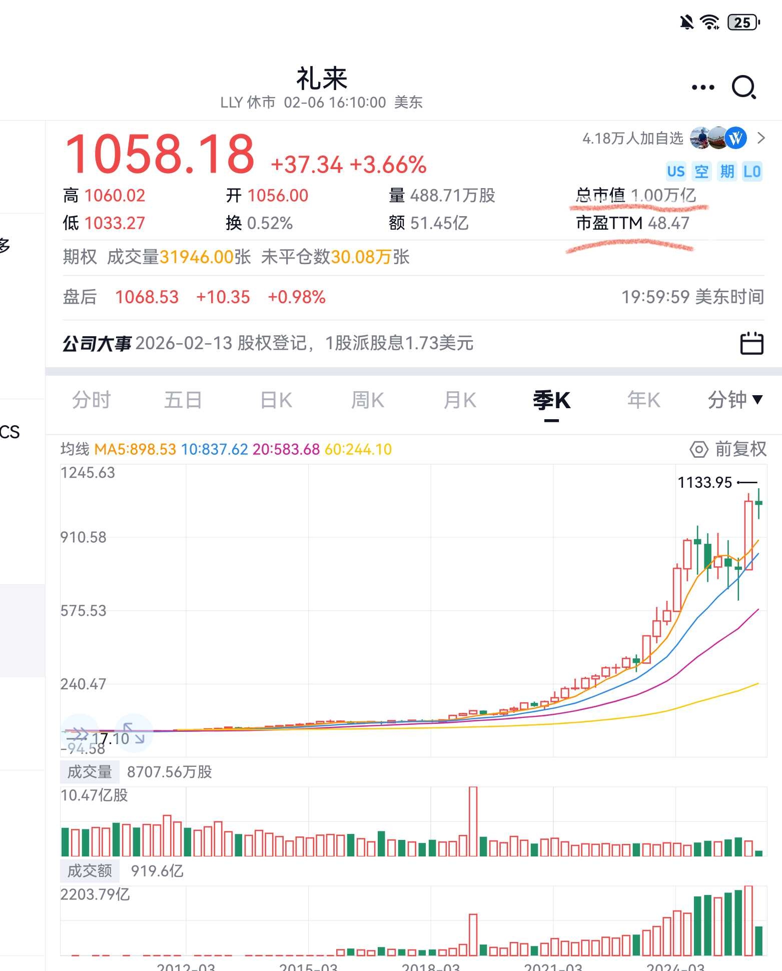 增长确定性: 礼来的业绩增长透明且爆发力极强,市场相信其未来几年的利润将持续暴涨,因此愿意给予其极高的估值溢价。