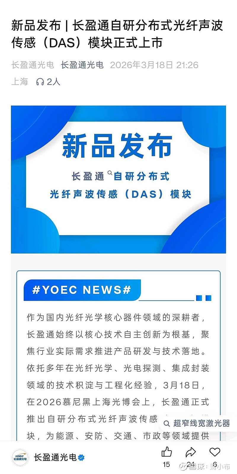 $长盈通(SH688143)$ 自研分布式光纤声波传感新品发布。网页链接长盈通自研分布式光纤声波传感(DAS)模块,是分布式振动与声波监测的核心硬件设备。产品以常规单模光纤作为感知介质,打破了传统离散传感器 “点位监测” 的局限,无需额外布设大量传感节点,仅通过单根光纤即可实现数十公里沿线振动、声波信号的分布式连续探测、实时解调与精准识别。