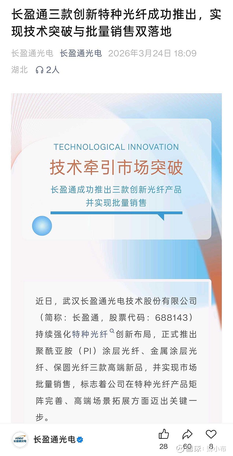 $长盈通(SH688143)$ 官网新产品发布。适用于特高压/超高压直流输电、智能电网等大电流测量场景。保圆光纤(Spun Fiber/旋转保偏光纤)采用高双折射保偏光纤预制棒,通过旋转拉丝工艺制成,具备圆偏振保持能力;凭借高内应力设计,对外界温度变化、弯曲形变及机械振动具有强抗干扰能力;是全光纤电流互感器(FOCT)专用传感光纤,适用于特高压/超高压直流输电、智能电网等大电流测量场景。#特高压# #智能电网#