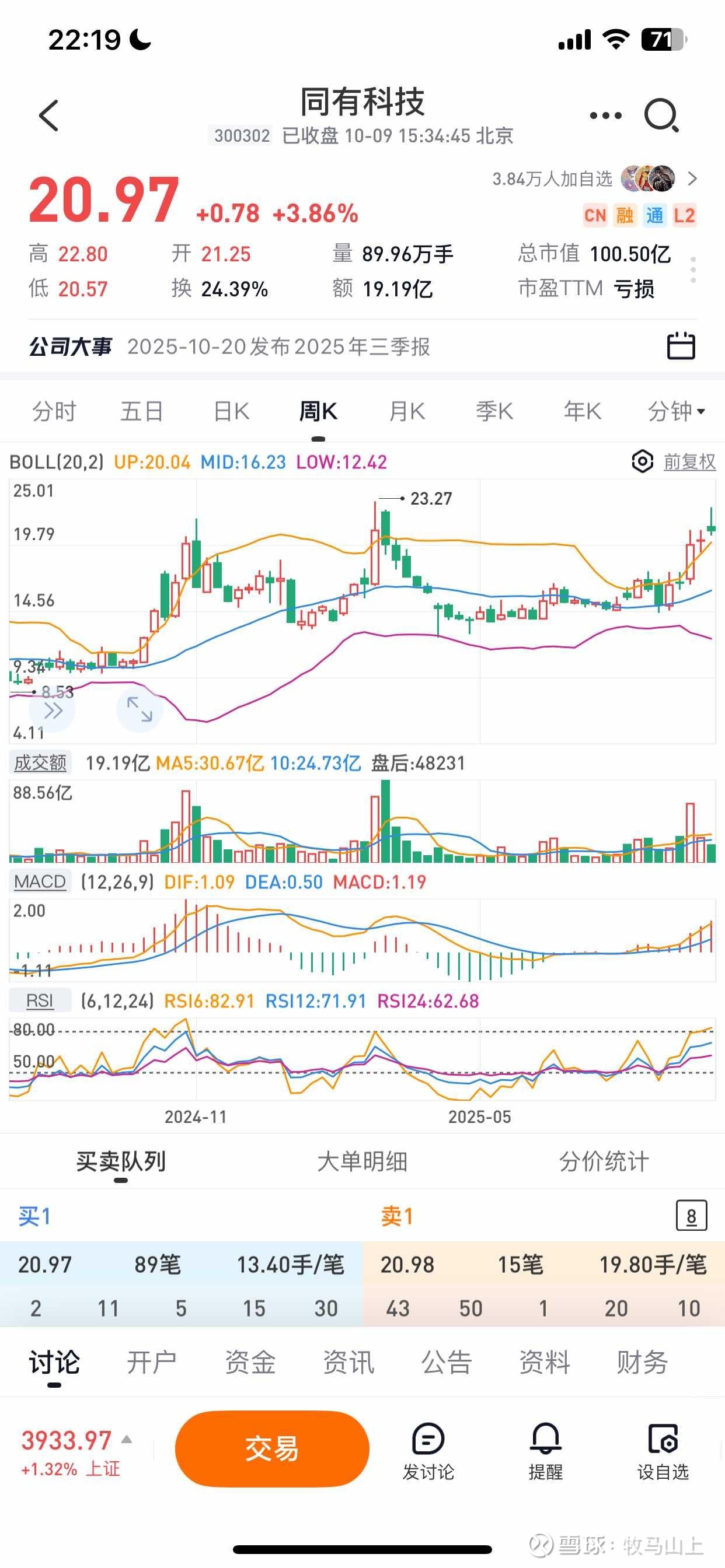$同有科技(SZ300302)$ 周线已经运行至24年10月底换手高值区域之上,今日收盘价刚好是今年2.28周收盘价,来到3月第一周高换手套牢密集区(周换手117%),主力解放了一年的套牢筹码,这里是又一个顶,还是新高在即?存储芯片板块8月以来很多都成功突破历史新高。同有科技8月第二周站上布林线中轨扭转趋势,但被上轨压制长达一个月,自9.10地量地价以来,成交量明显放大,尤其是9月22日突破8月22日高点之后,成交量就始终保持高位态势,红长绿短,明显是做多的节奏,今日换手24%以上,是近期最大值,虽然冲高回落较多,但最高点距离前高仅2%距离,股价运行与周布林线上轨外,910以来构建了“中阳+十字星”态势,上周两个交易日、本周两个交易日,明日再缩量整固一天,周线再多一颗星,那下周就有望放量破新高了!本轮行情布林线与去年9.24相似,沿上轨突破,目前喇叭口张得越来越大,趋势挺不错的。