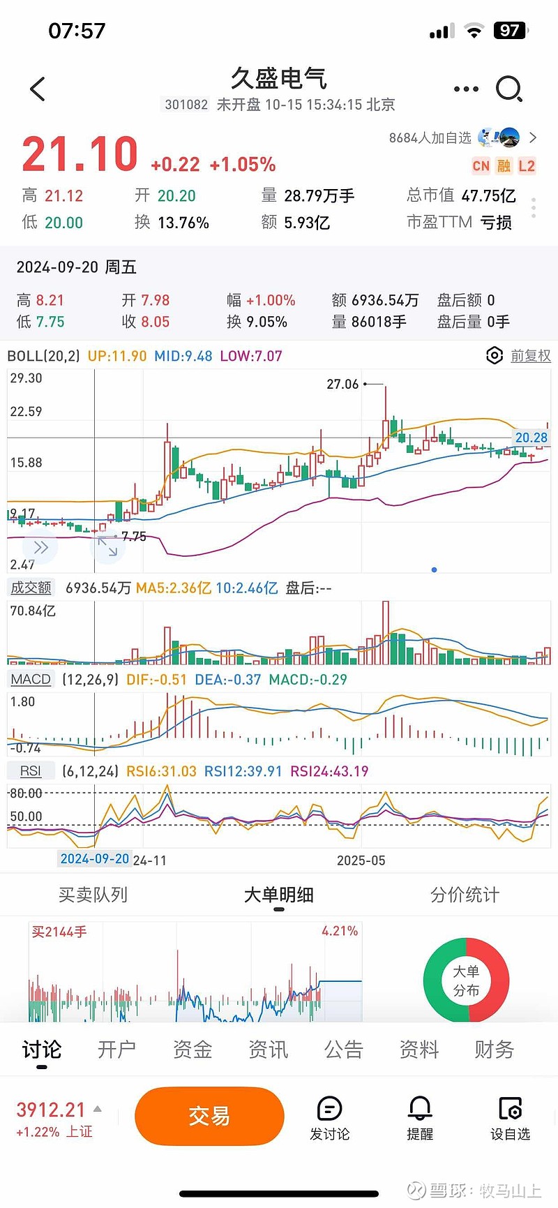 $久盛电气(SZ301082)$ 周线图看久盛电气,本轮高点27回落至17.15,长达4个月时间,9月30日那根周线金针探底态势与去年9.20那根探底周线相似,十月五个交易日股价已经反弹17%,股价已经运行至去年11月和今年4月高点附近,前天最高点触碰了去年11月高点22.23元,技术上具备持续反弹的可能,来到高位成交密集区,震荡加剧,洗盘猛烈,后面如果能继续冲击5月高点,那么就可能实现月线翻倍可能。5月份能创出翻倍行情着实很厉害,因为4月解禁了上亿股。拉高后股东大幅减持,股东人数翻倍,达3万人,经过4个月的洗盘,四季度大概率走补涨。