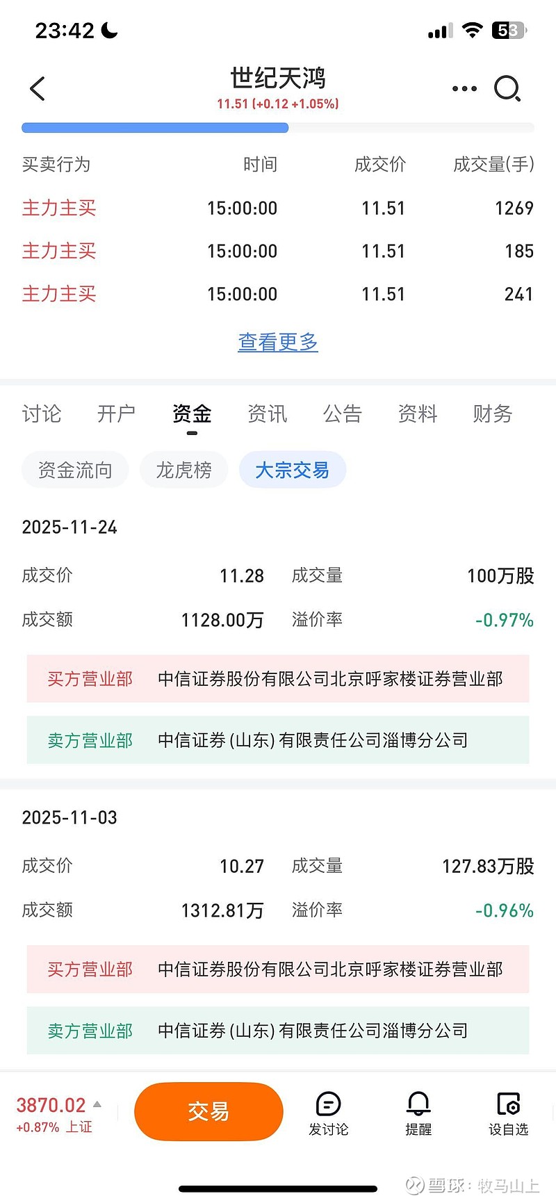 $世纪天鸿(SZ300654)$ 今天换手这么大,大股东竟然没有减持?距离最后截止日期还有5天,要不来个涨停板减持一下?自8月13日晚公告拟减持1098.37万股以来,大股东只有两次交易行为,一个是11月3日,一个是11月24日,合计通过大宗交易卖出227.83万股,还有871万待减持,冲减持时间和数量看,大股东也似乎不急于减持,是否有配合压制股价的因素不清楚,接盘方是著名柚子徐开东席位。