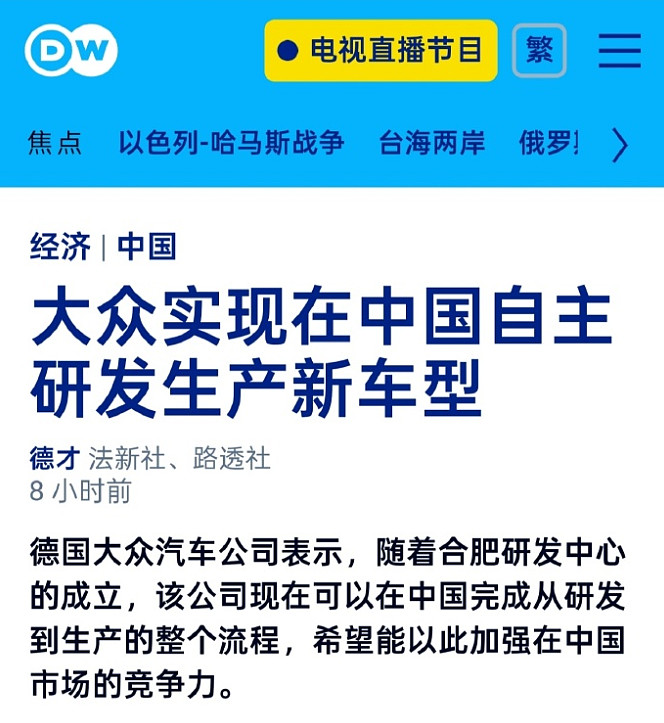 德国大众汽车宣布,其电动汽车现在可以完全在中国工厂制造。