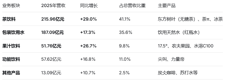 2025 年年报的数据显示,公司品类结构实现了历史性的优化:茶饮料占比 41.1%、包装水占比 35.6%、功能饮料占比 11.0%、果汁饮料占比 9.8%、其他产品占比 2.5%,彻底摆脱了对单一包装水业务的依赖。