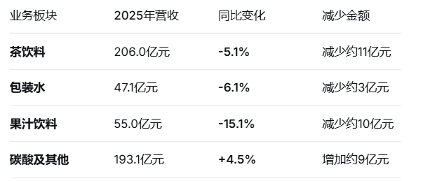 康师傅——茶饮料增速已连续四年下滑——2022年至2025年同比增幅分别为7.89%、5.39%、1.3%和-5.1%