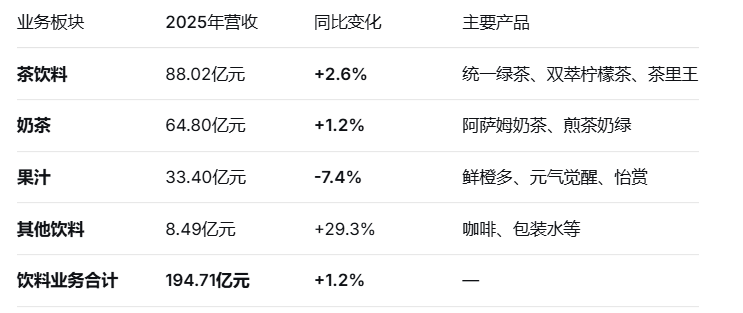 统一——茶饮料是统一板块中规模最大的品类,2025年收入88.02亿元,同比仅+2.6%