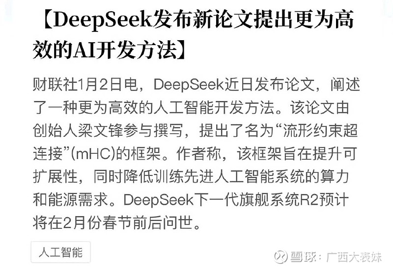 2️⃣ DeepSeek R2:R2预计在2026年2月春节前后发布,将采用流形约束超连接(mHC)新架构,提升可扩展性并降低算力需求。