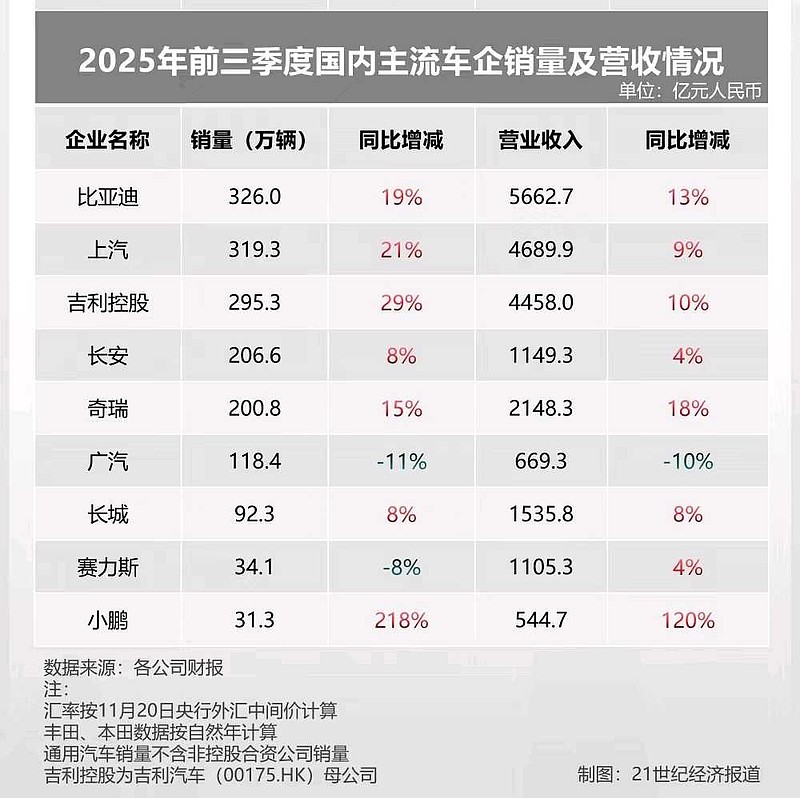 图表为2025年前三季度国内主流车企销量及营收情况,销量和营收的情况图表中清晰可见,也不是我们今天讨论的重点,重点分析一下各家车企销量和营收之间的关系,从而我们可以看出究竟是哪些企业在打价格战?