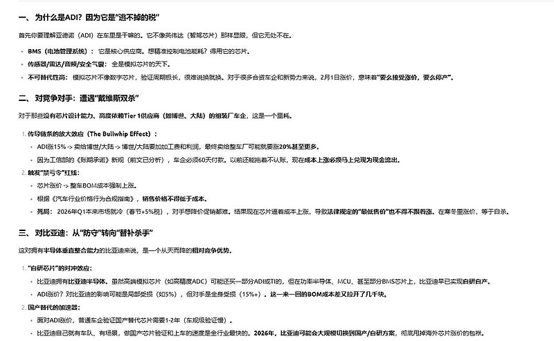 . ADI 涨价?对比亚迪的影响可能是局部受损(如5%),但对手是全身受损(15%+)。这一来一回的 BOM 成本差又拉开了几千块。