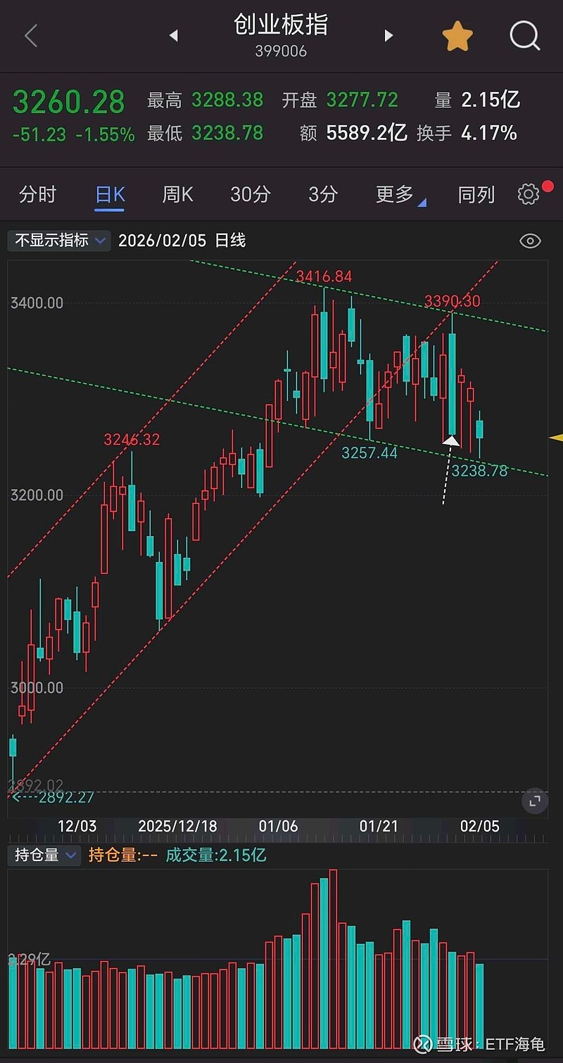最近创业板持续缩量,目前处于缓慢的下跌通道中,价格多次触碰下轨线,均未形成有效的向上反弹。加之2月2日(图中白色箭头处)阴线实体过大,个人主观判断跌破下轨线的可能性较大,当前观点依旧偏空!个人主观判断,不构成交易依据!$创业板指(SZ399006)$