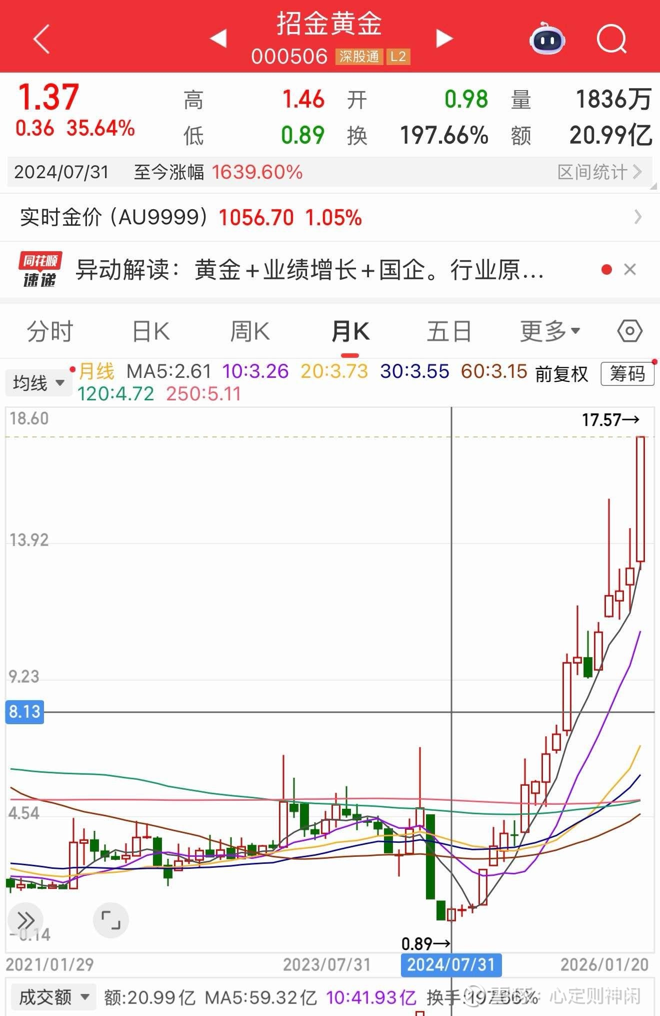 $招金黄金(SZ000506)$ 是我眼花了,还是行情软件出错了?一年多以前这货的股价跌到八毛九了?按今天收盘价,从低点到现在几乎二十倍了!最近二十个月连续十九根阳线,原来最牛的黄金股是你啊!$中金黄金(SH600489)$ $山金国际(SZ000975)$