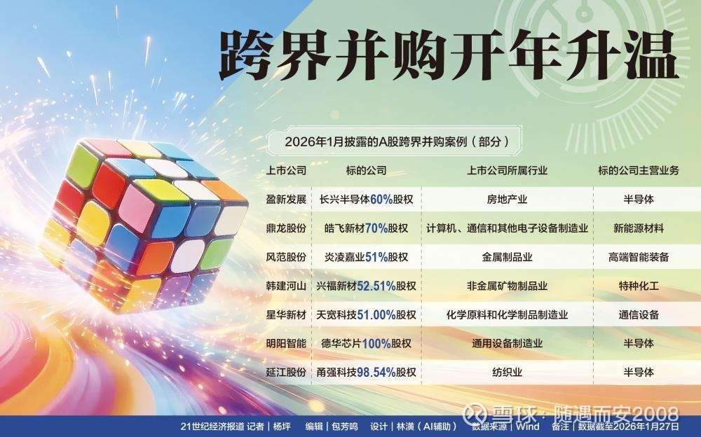 据不完全统计,仅2026年1月期间,就有盈新发展、康欣新材、鼎龙股份、韩建河山、延江股份、星华新材、风范股份、明阳智能等公司筹划跨界并购的案例,其中不少为传统制造业公司向半导体、高端装备等方向转型。