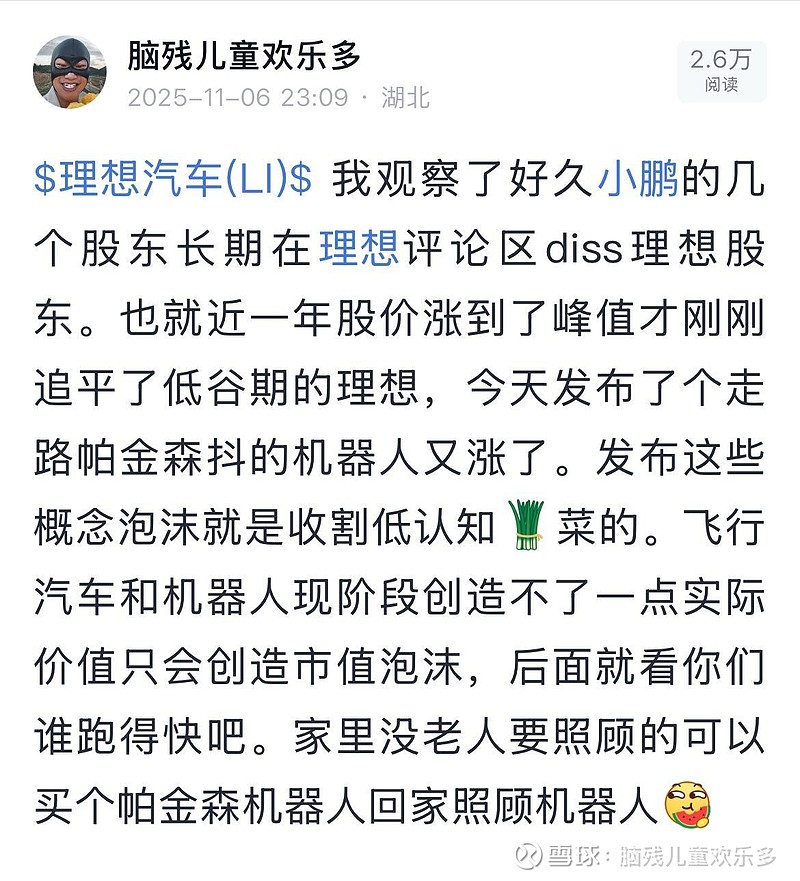 $理想汽车-W(02015)$ 我发现蔚来股东黑理想股东情况很少,但这个靠屌丝十万块网约车级别的mona03起量的牌子小鹏股东却天天在理想股票评论区以黑理想为乐,网上也是小鹏买的水军黑理想车主乱停车。果然低端的牌子吸引低端的股东,何小鹏就是个阴险狡诈小人面相,除了天天舔雷军李斌这两个好大哥啥也不会。找个小学文化学历的合伙人造了个长春航展首秀空中撞机失火🔥无人机骗骗融资罢了,华强北买的配件拼装下就变无人机高科技了。我曾在去年11月小鹏股价110元顶点精准预言叫你们快跑,今天我在预言一次,小鹏股价今年50元左右绝对可以到![]()