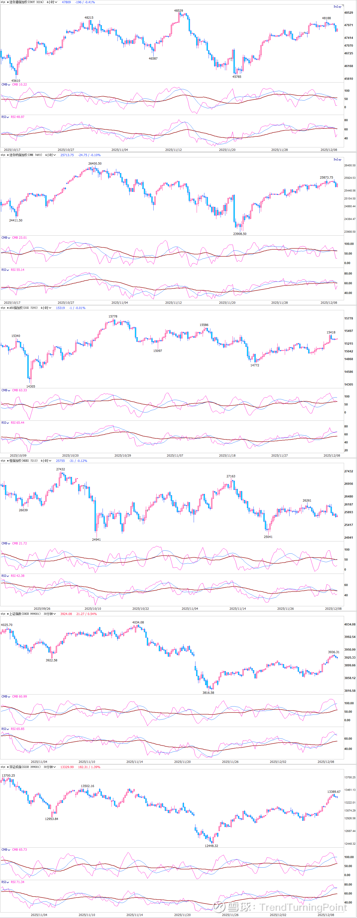 2025/12/08,道指加权亚欧时段窄幅震荡,美股开盘短暂反弹,第一权重高盛(GS.US)续创历史新高875.56,道指加权最高48064点,最低47668点,从4小时CMB(复合指标)来看,数值10.22,较上一收盘数值63.29有较大下降,处在轻度超卖节点,4小时RSI(相对强弱指标)数值48.97,较上一收盘数值明显下降,两项指标数值均处在中轨之下;