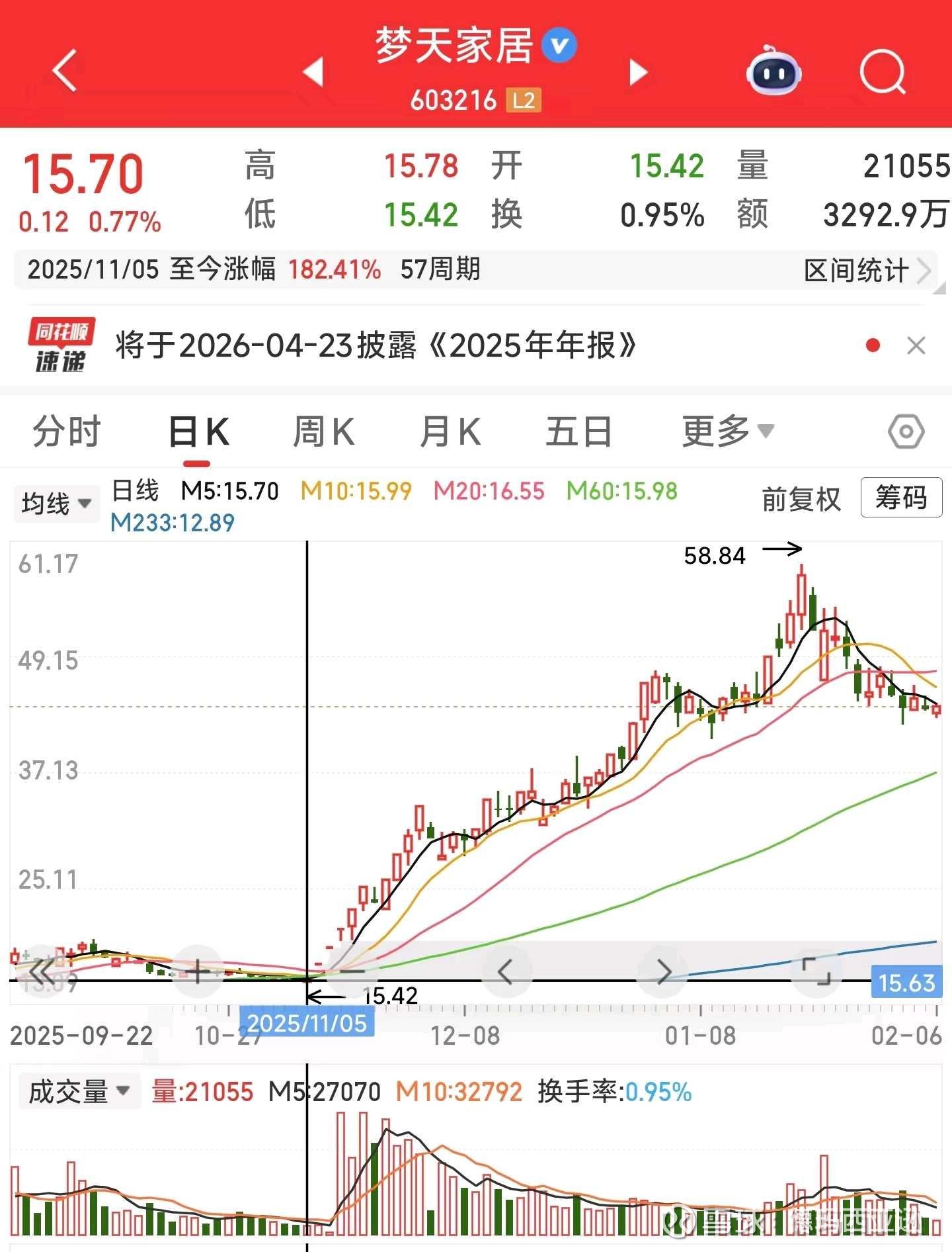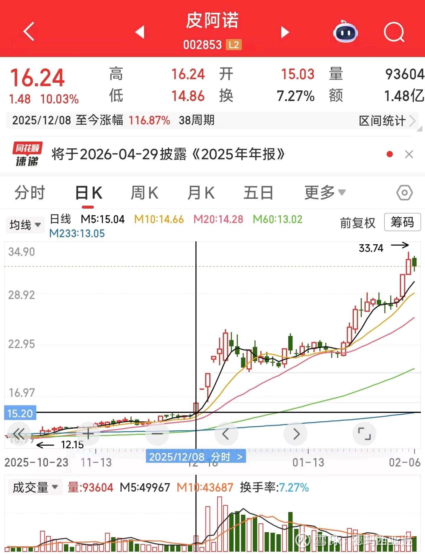 2025年12月8日涨停,收盘价16.24元。至今涨幅116.87%。12月8日当晚公告筹划控制权变更事项停牌。12月16日复牌当日一字板涨停。截至2026年2月6日收盘价32.01元,对应市值58.55亿。原实控人马礼斌共持有公司39.12%的股份,以15.31的价格协议转让9.78%的股份,剩余29.34%。以32.01元计算,至今盈利约为(32.01-15.31)×5366.5万股=9.06亿元。