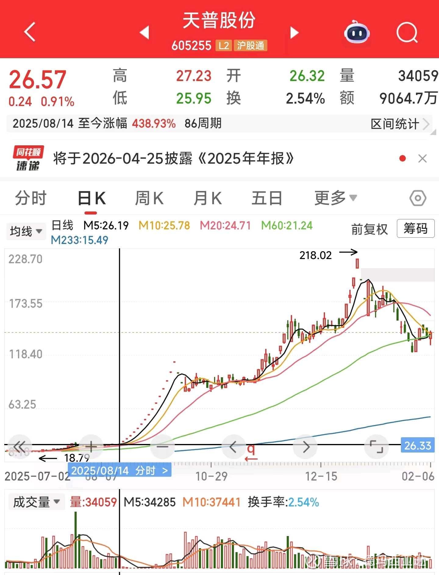 2025年8月14日+0.91%,收盘价26.57元。至今涨幅438.93%。8月14日当晚公告筹划控制权变更事项停牌。8月22日复牌当日一字板涨停。截至2026年2月6日收盘价141.9元,对应市值190.26亿。原实控人尤建义及其一致行动人共持有公司75%的股份,以23.98的价格协议转让18.75%的股份,剩余56.25%。以141.9元计算,至今盈利约为(141.9-23.98)×8560万股=90.7亿元。
