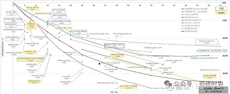 1.metsera的管线包括GLP1针剂/口服,Amylin针剂,GLP1+Amylin针剂。其中进度最快的是GLP针剂到IIb,IIa数据时12周减少11.3%,这个数据很难有竞争力。12周数据里最好的是安进AMG133降幅14.5%,另外就是博瑞的0504,降幅13.8%。
