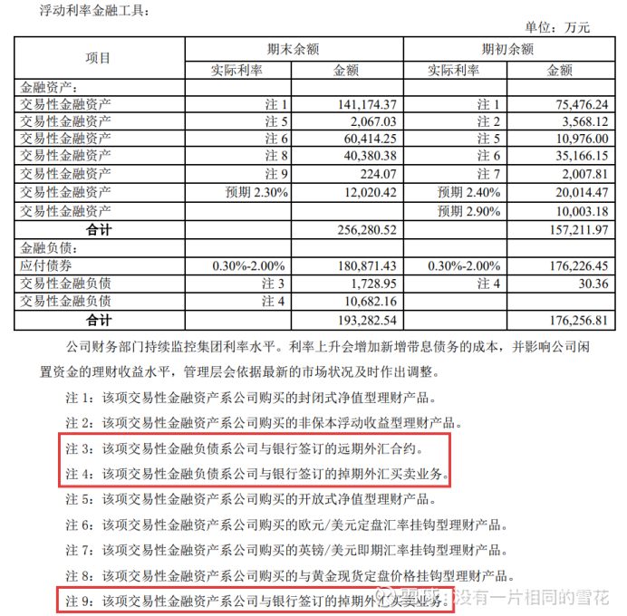 ⑤公允价值变动收益同比减少2.09亿元,大概率是本期公司在掉期外汇买卖业务和远期外汇业务中相比去年同期少赚钱以及亏钱了,这部分很可能是和财务费用中的汇兑损益相关联(猜测);