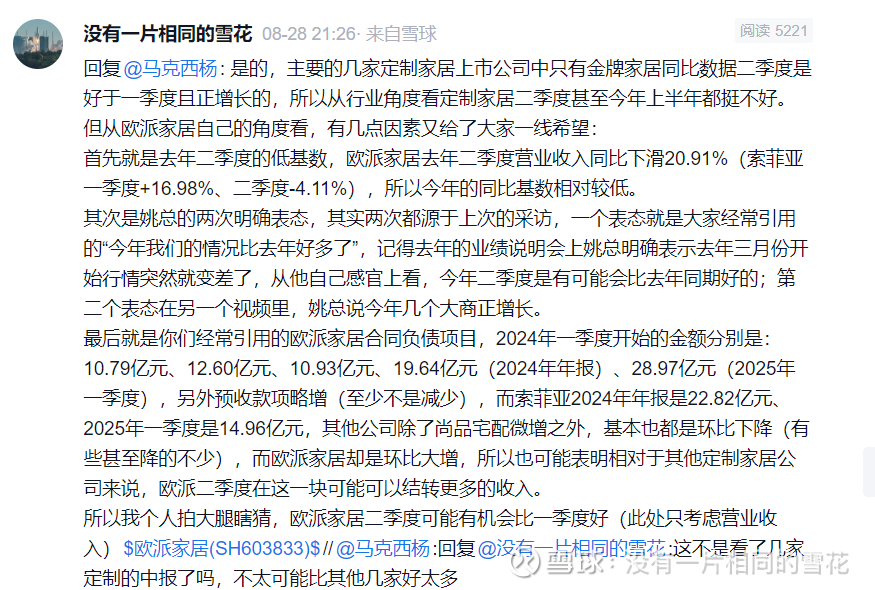总结:欧派家居2025年上半年的业绩正好落在我个人预期的下限,我原本对欧派家居中报的预期就是二季度营业收入同比数据好于一季度(利润影响因素太多不做预测),