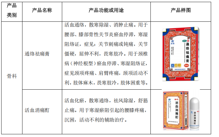 治疗骨科的主要产品包括通络祛痛膏、活血消痛酊、壮骨麝香止痛膏、伤湿止痛膏、关节止痛膏、吲哚美辛贴片、丹鹿通督片等;