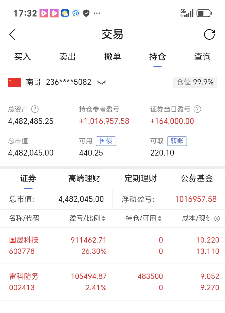 随后,便是高切低,布局雷科防务。 在当前市场环境下,我的核心逻辑是“避险”与“确定性”。军工板块具备天然的防御属性,且受外部地缘政治和内部“十四五”规划的双重驱动,行业景气度高,确定性较强。而雷科防务作为军工信息化领域的核心标的,技术壁垒深厚,位置相对较低,安全边际更高。因此,从高位的国晟科技切换到低位的雷科防务,是一次典型的“卖高买低、攻守兼备”的策略调整。
