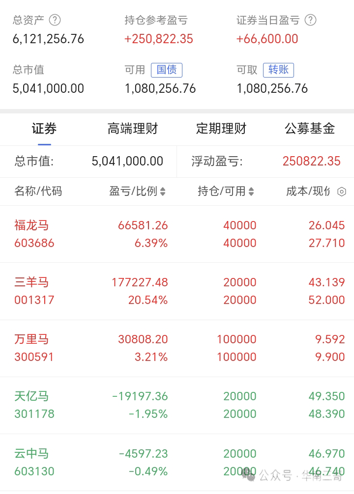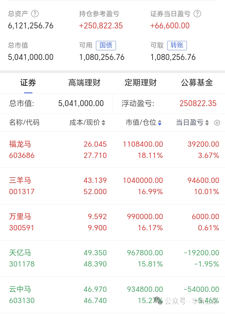 今天云中马、天亿马、三羊马、福龙马、万里马——五匹马,一股未动。