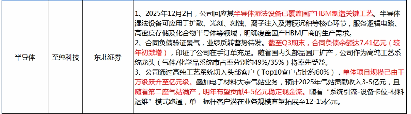 1、2025年12月2日,公司回应其半导体湿法设备已覆盖国产HBM制造关键工艺。半导体 湿法设备可应用于扩散、光刻、刻蚀、离子注入及薄膜沉积等核心环节,服务逻辑电路、 高密度存储及化合物半导体等领域,明确覆盖国产HBM厂商的生产需求。