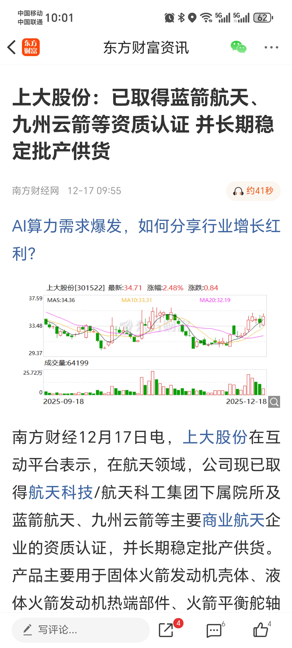 上大股份12月16日在互动平台表示,在海外航空航天领域,公司已通过GE、赛峰、霍尼韦尔等国际航空企业的资质认证,并建立了合作关系。