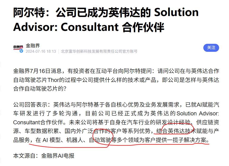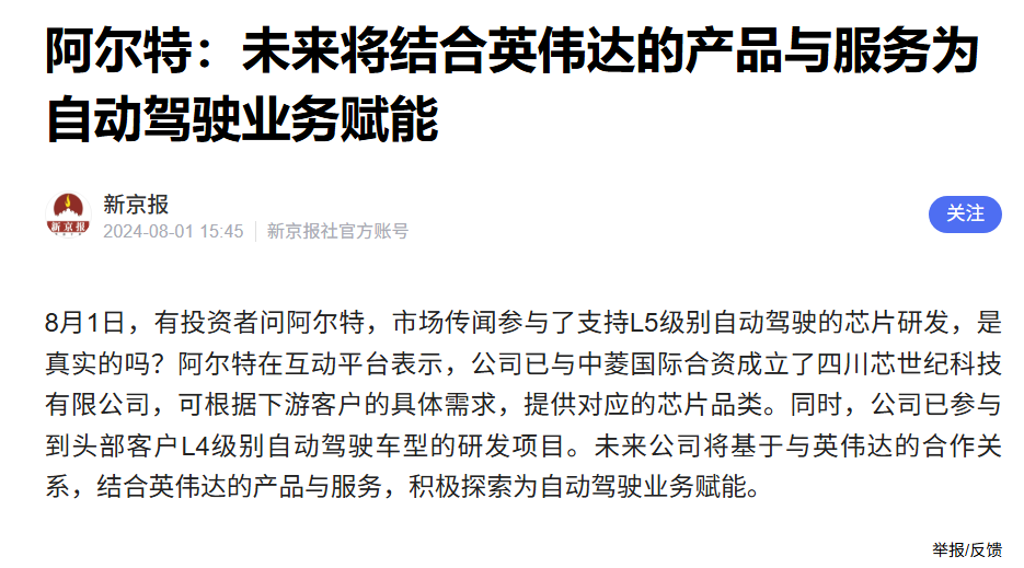 8月1日,有投资者问阿尔特,市场传闻参与了支持L5级别自动驾驶的芯片研发,是真实的吗?